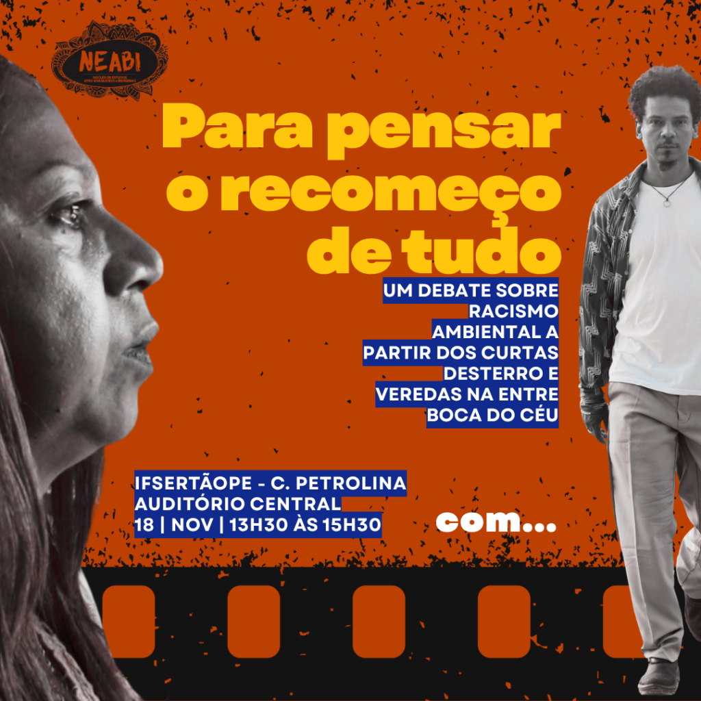 O Núcleo de Estudos Afro-Brasileiros e Indígenas (NEABI) do Campus Petrolina do IFSertãoPE realizará a mesa-redonda “Para pensar o recomeço de tudo: um debate sobre racismo ambiental a partir dos curtas Desterro e Veredas na Entre Boca do Céu”. O evento, gratuito e aberto a estudantes, servidoras e servidores de escolas públicas, acontecerá no dia 18 de novembro, às 13h30, no auditório do Campus Petrolina. A iniciativa promoverá uma reflexão sobre o impacto das mudanças climáticas em comunidades tradicionais e periferias do Semiárido brasileiro.
