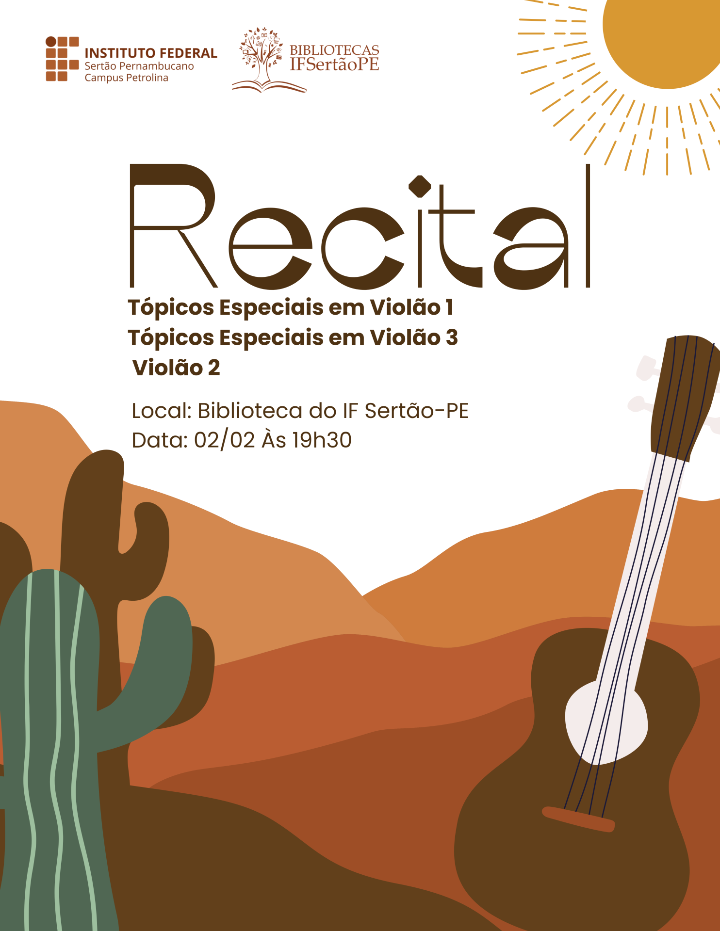 Na próxima segunda-feira (02), às 19h30, será realizado um Recital de Violão na Biblioteca do Campus Petrolina do Instituto Federal do Sertão Pernambucano (IFSertãoPE).