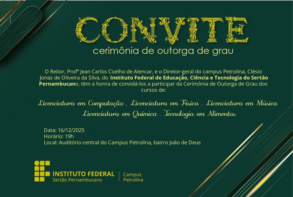 Com muito orgulho, o campus Petrolina do IFSertãoPE convida toda comunidade para participar da cerimônia de Colação de Grau dos cursos superiores, que acontecerá nesta terça-feira (16), às 19h, no Auditório central da unidade de ensino. A solenidade conferirá grau aos concluintes dos cursos de Tecnologia em Alimentos e das Licenciaturas em Física, Música, Computação e Química.