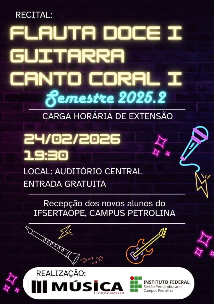 O campus Petrolina do Instituto Federal do Sertão Pernambucano (IFSertãoPE) promove, no dia 24 de fevereiro, às 19h30, o Recital das turmas de Flauta Doce I, Guitarra e Canto Coral I. A apresentação será realizada no Auditório Central do campus e integra a programação de recepção dos novos estudantes dos cursos Subsequentes e de Graduação.