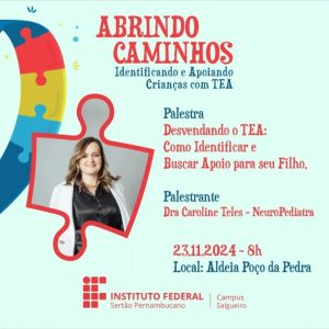 O campus Salgueiro do Instituto Federal do Sertão Pernambucano (IFSertãoPE) realizará no próximo sábado (23), a partir das 8h, o evento “Abrindo Caminhos: Identificando e Apoiando Crianças com TEA”. A iniciativa tem como objetivo principal conscientizar a comunidade da Aldeia Poço da Pedra sobre o Transtorno do Espectro Autista (TEA) e a importância de um diagnóstico precoce e de um acompanhamento adequado para crianças com essa condição.
