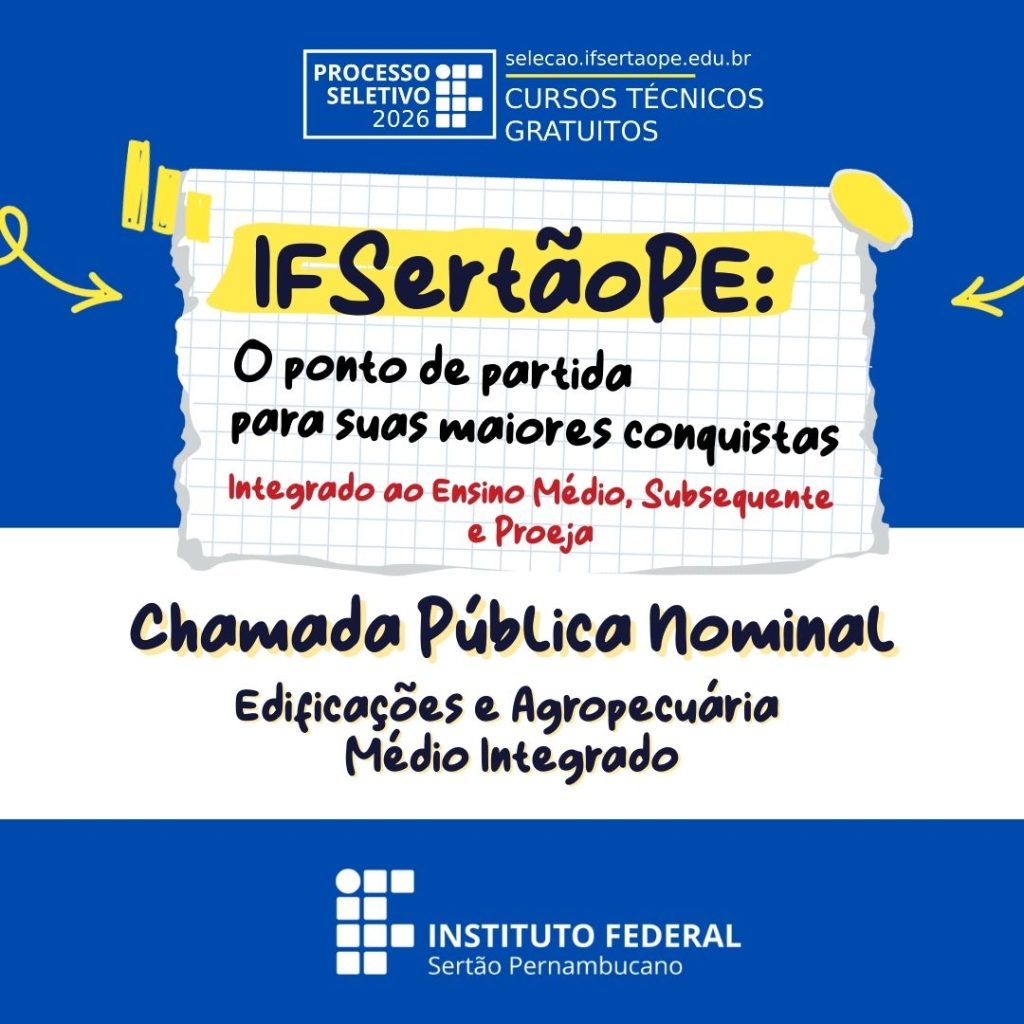 O Campus Santa Maria da Boa Vista do Instituto Federal do Sertão Pernambucano (IFSertãoPE) publicou edital de chamada pública para o preenchimento de vagas remanescentes dos cursos técnicos de nível médio integrado em Agropecuária e Edificações, com ingresso no ano letivo de 2026. Ao todo, estão sendo ofertadas 31 vagas, distribuídas da seguinte forma: três vagas para o curso Técnico em Agropecuária (turno da manhã), três vagas para o curso Técnico em Edificações (turno da manhã) e 25 vagas para o curso Técnico em Edificações (turno da tarde).