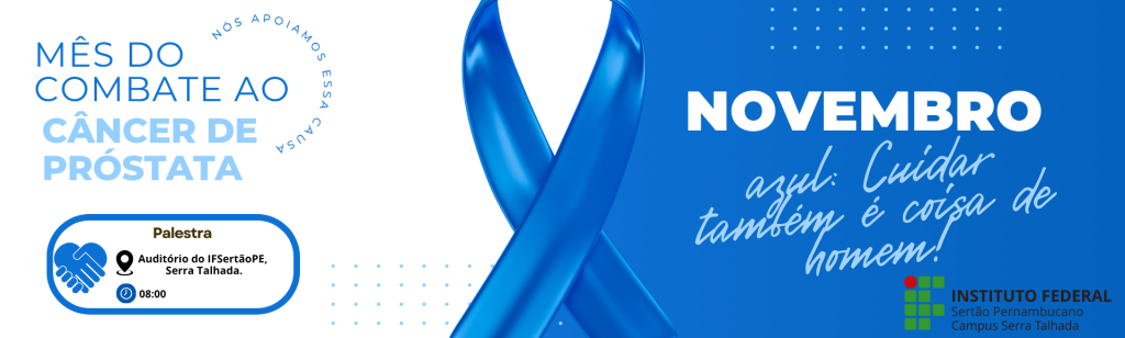 O campus Serra Talhada do IFSertãoPE realiza, no dia 19 de novembro, às 8h, uma atividade alusiva à campanha Novembro Azul, com foco na conscientização e no fortalecimento das práticas de prevenção voltadas à saúde masculina. A iniciativa ocorrerá no auditório do campus.