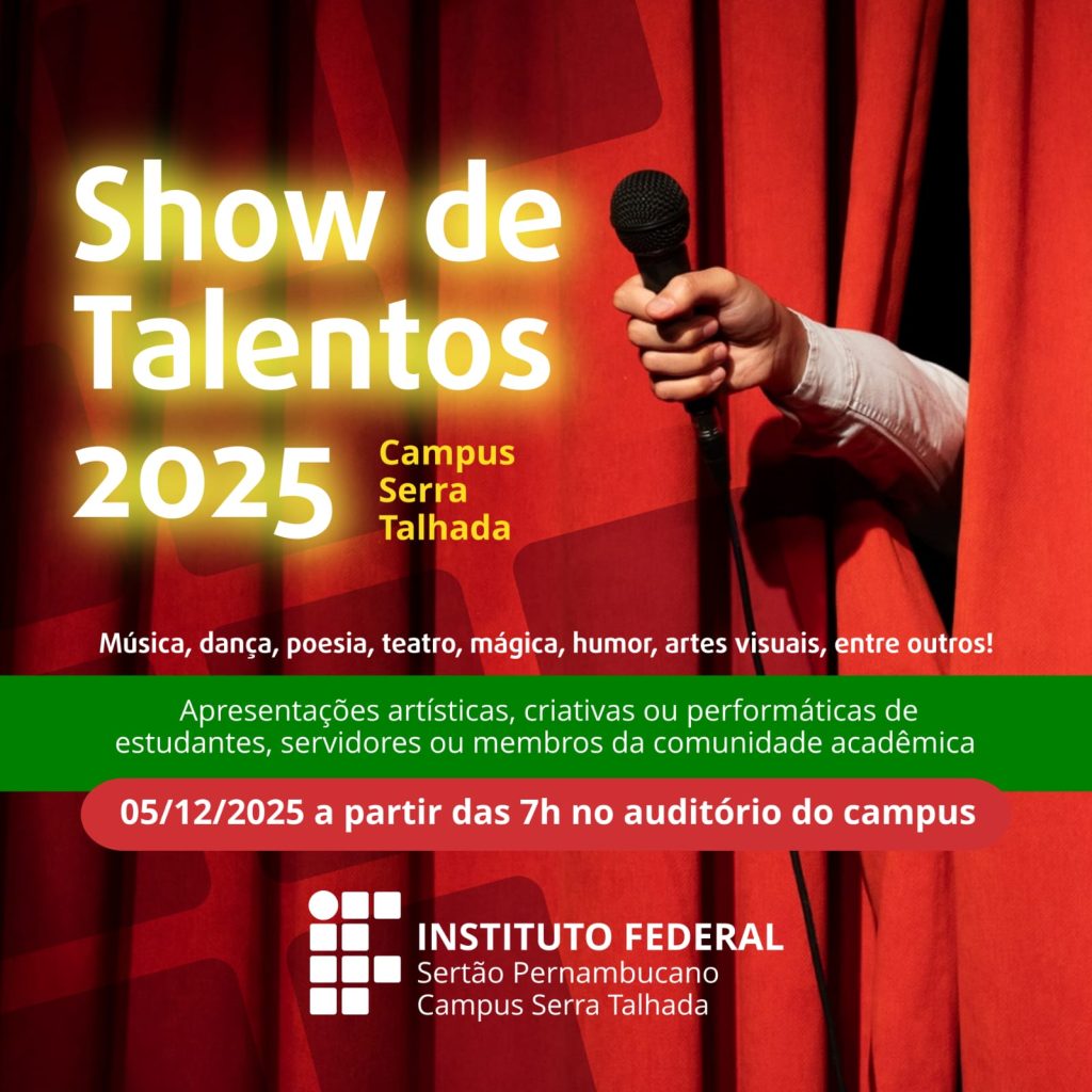 O campus Serra Talhada do IFSertãoPE anuncia a realização do Show de Talentos 2025, iniciativa destinada a incentivar a expressão artística e cultural da comunidade estudantil. O evento ocorrerá no dia 5 de dezembro, a partir das 7h, no auditório do campus.