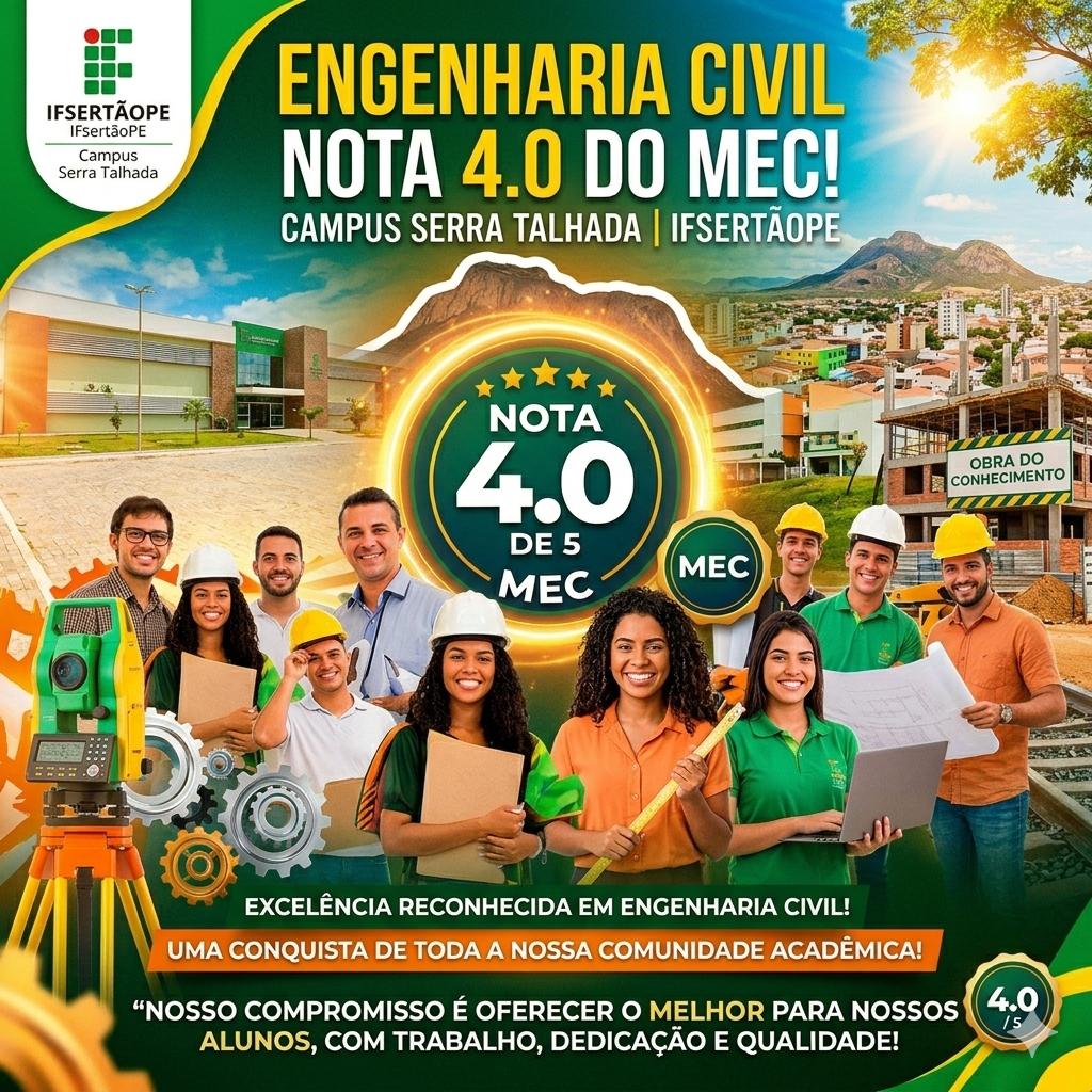O curso de Engenharia Civil do Campus Serra Talhada do IFSertãoPE obteve conceito 4 na avaliação externa realizada pelo Ministério da Educação (MEC), para fins de reconhecimento do curso. O processo avaliativo foi conduzido pelo Instituto Nacional de Estudos e Pesquisas Educacionais Anísio Teixeira (Inep) e ocorreu no período de 2 a 4 de março de 2026. O resultado foi divulgado no sistema e-MEC na última segunda-feira (09).