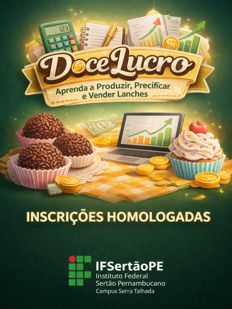 O campus Serra Talhada do IFSertãoPE publicou a lista de inscrições deferidas para o curso de Formação Inicial e Continuada (FIC) “Doce Lucro: Aprenda a Produzir, Precificar e Comercializar Lanches”. A ação tem como objetivo qualificar estudantes e a comunidade em geral, com ênfase no desenvolvimento de habilidades voltadas ao empreendedorismo e à geração de renda.