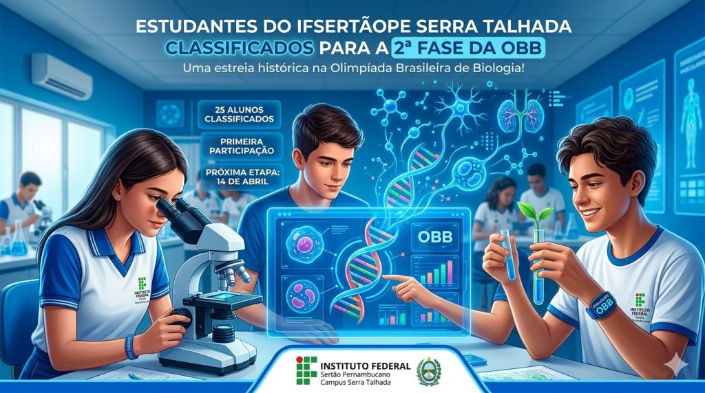 Estudantes do Ensino Médio Integrado do Campus Serra Talhada do IFSertãoPE participaram, no dia 03 de março, da primeira etapa da Olimpíada Brasileira de Biologia (OBB), reconhecida como uma das principais competições científicas direcionadas ao Ensino Médio no Brasil. Como resultado, 25 alunos da instituição obtiveram classificação para a segunda fase, realizada em 18 de março, evidenciando elevado desempenho acadêmico e comprometimento com a formação científica.