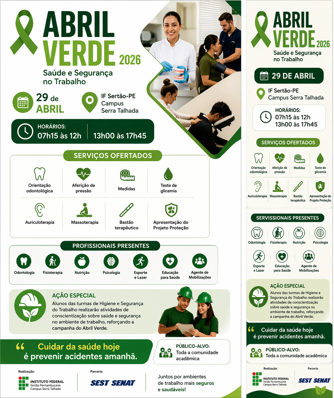 O campus Serra Talhada do IFSertãoPE realizará nesta quarta-feira (29) uma programação alusiva à campanha Abril Verde, voltada à promoção da saúde e à prevenção de acidentes no ambiente de trabalho. A iniciativa ocorrerá nos turnos da manhã, das 07h15 às 12h, e da tarde, das 13h às 17h45, contemplando a comunidade acadêmica com uma série de serviços e atividades educativas.