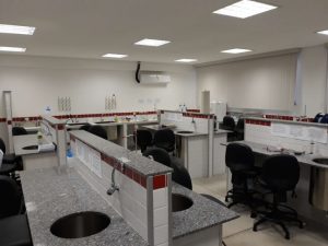 O laboratório tem a capacidade de comportar um total de 20 alunos, provido de bancadas para apoio da realização das atividades, e com assentos com alturas adequadas. Na realização das atividades em laboratório é necessária a presença do técnico responsável pelo mesmo. O laboratório possui área física de 61 m².