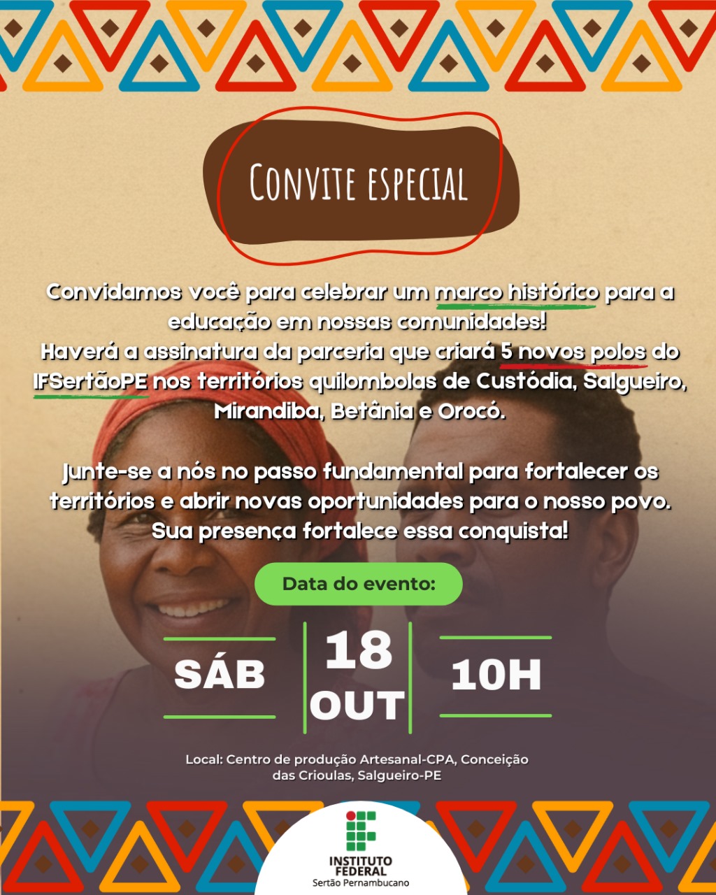 O Instituto Federal do Sertão Pernambucano (IFSertãoPE), por meio da Pró-Reitoria de Ensino (Proen) e da Diretoria de Educação a Distância (DEaD), promoveu no último sábado (18) uma cerimônia de assinatura do Termo de Manifestação de Interesse entre o Instituto e cinco comunidades quilombolas de Pernambuco, com o objetivo de implantar novos polos de Educação a Distância (EaD). O evento…