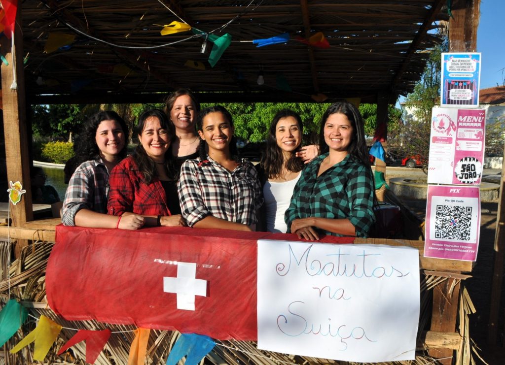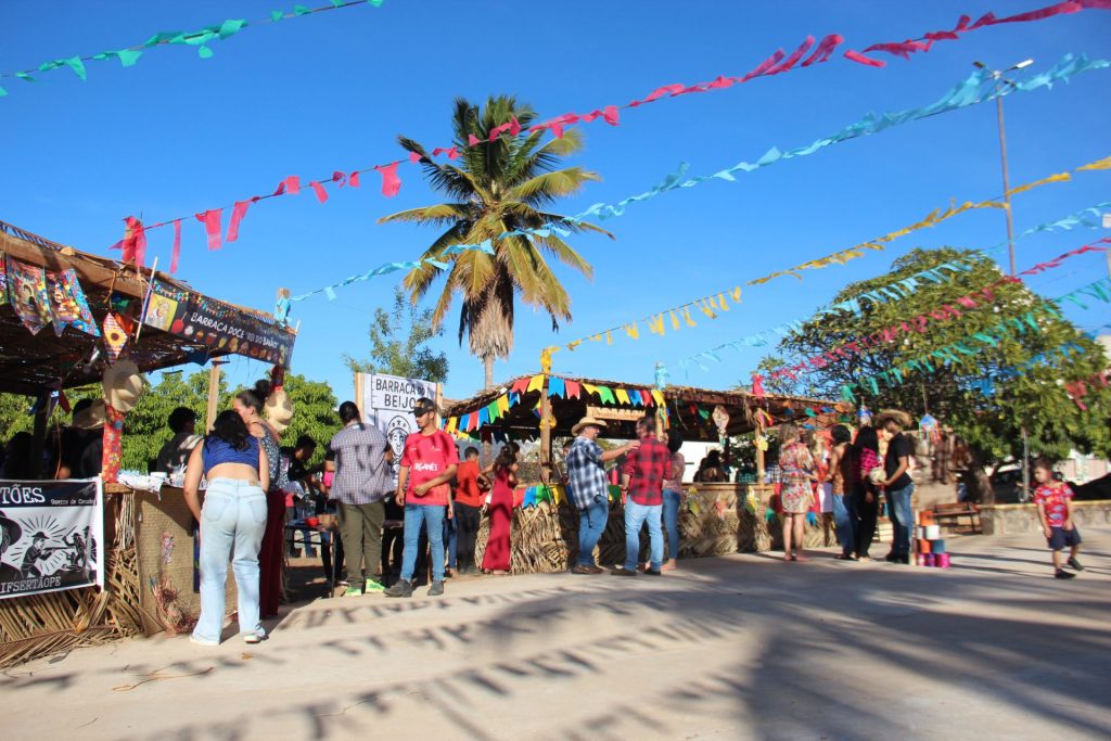 Teve forró, brincadeiras, quadrilha, sanfoneiro, comidas típicas, fogueira, em um cenário organizado especialmente para esse momento, que trazia referências às tradicionais festas juninas.