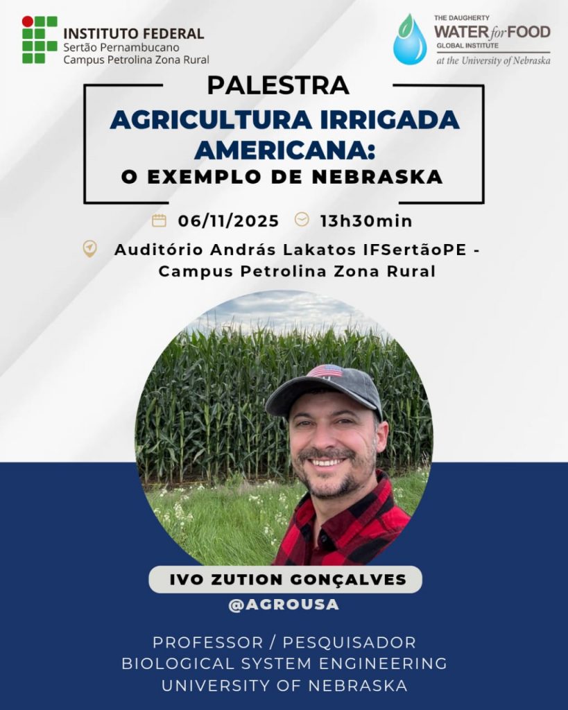 O campus Petrolina Zona Rural do IFSertãoPE realiza, no dia 6 de novembro, palestra com o tema “Agricultura Irrigada Americana: o exemplo de Nebraska”, ministrada pelo professor e pesquisador da University of Nebraska, Ivo Zution Gonçalves.