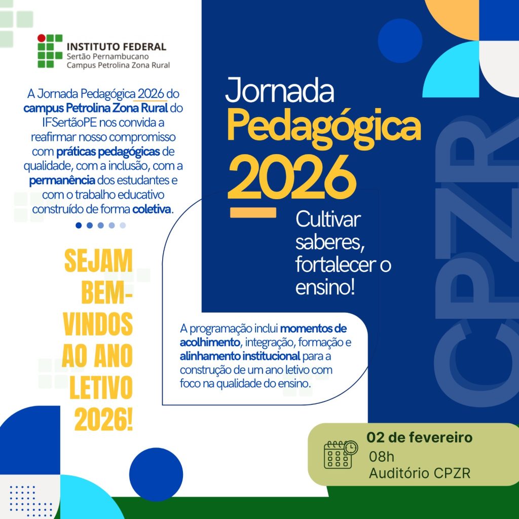 O campus Petrolina Zona Rural do IFSertãoPE realiza, na próxima segunda-feira (2), a Jornada Pedagógica 2026. O evento, voltado aos docentes e técnicos-administrativos do campus, marca o início do ano letivo, reafirmando o compromisso com práticas pedagógicas de qualidade e com o trabalho educativo construído de forma coletiva.