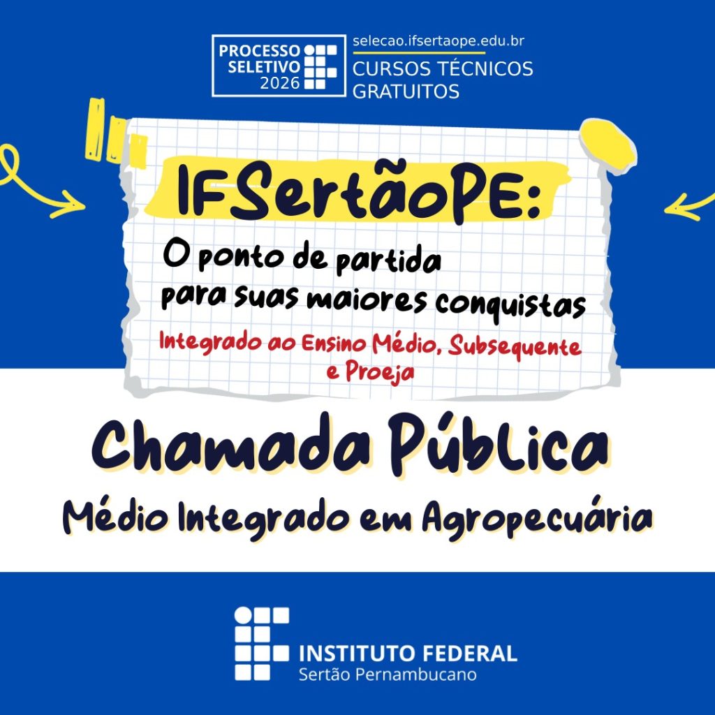 O campus Petrolina Zona Rural do Instituto Federal do Sertão Pernambucano (IFSertãoPE) publicou, nesta terça-feira (3), o edital n.º 04/2025, referente à chamada pública nominal para o preenchimento de vagas remanescentes do Ensino Médio Integrado em Agropecuária, para ingresso em 2026. A chamada tem como objetivo preencher as vagas ociosas após o 2.º remanejamento do Processo Seletivo 2026.