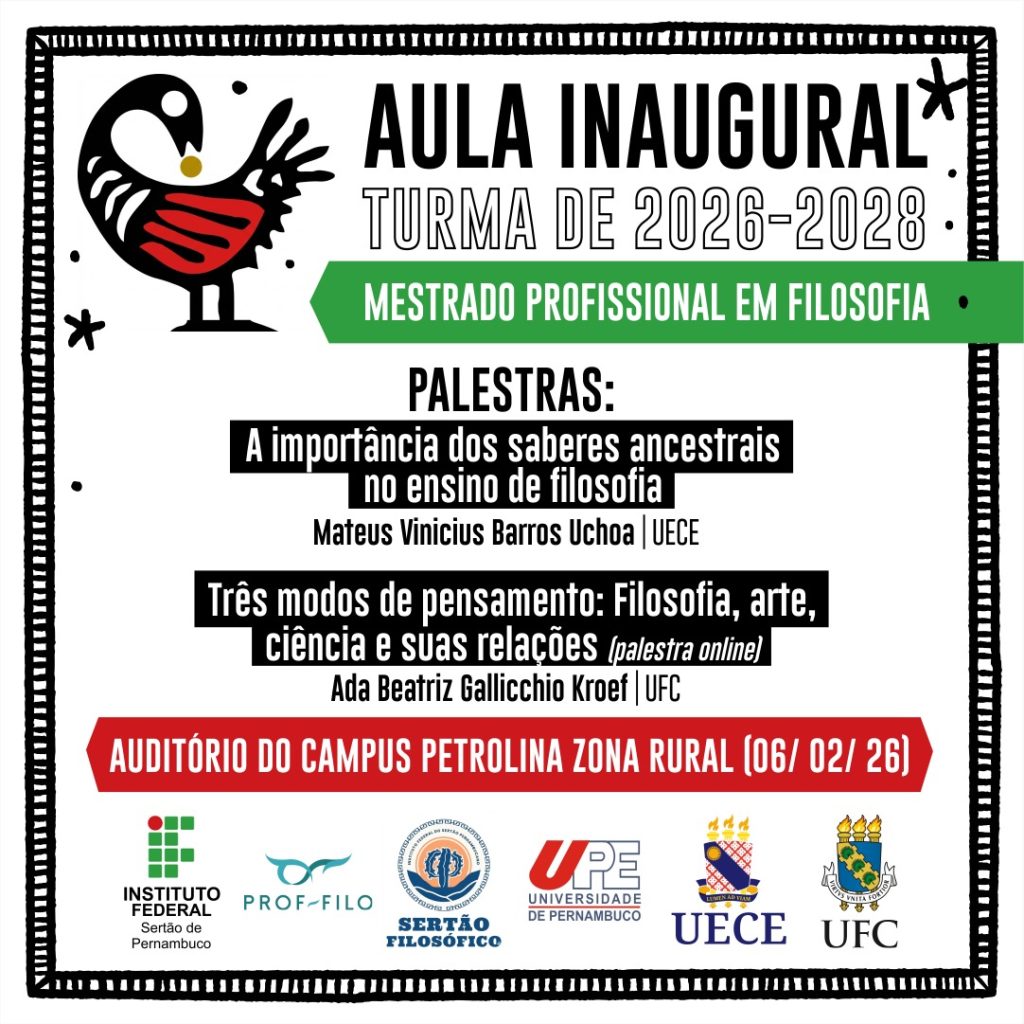 A programação apresenta a palestra “A importância dos saberes ancestrais no ensino de filosofia”, ministrada pelo professor Mateus Vinicius Barros Uchoa (UECE). Em seguida, a professora Ada Beatriz Gallicchio Kroef (UFC) proferirá a palestra “Três modos de pensamento: Filosofia, arte ciência e suas relações”.