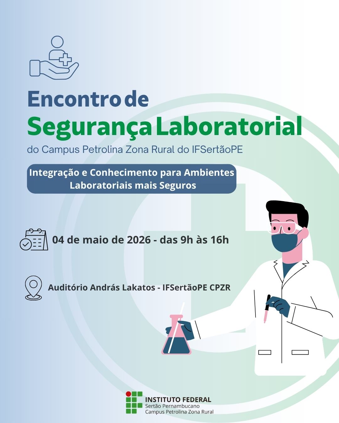 Promover a conscientização, capacitação e fortalecimento da cultura de segurança nos ambientes laboratoriais do campus Petrolina Zona Rural do IFSertãoPE. Este é o objetivo do Encontro de Segurança Laboratorial, que acontece no dia 4 de maio, na instituição, apresentando como tema